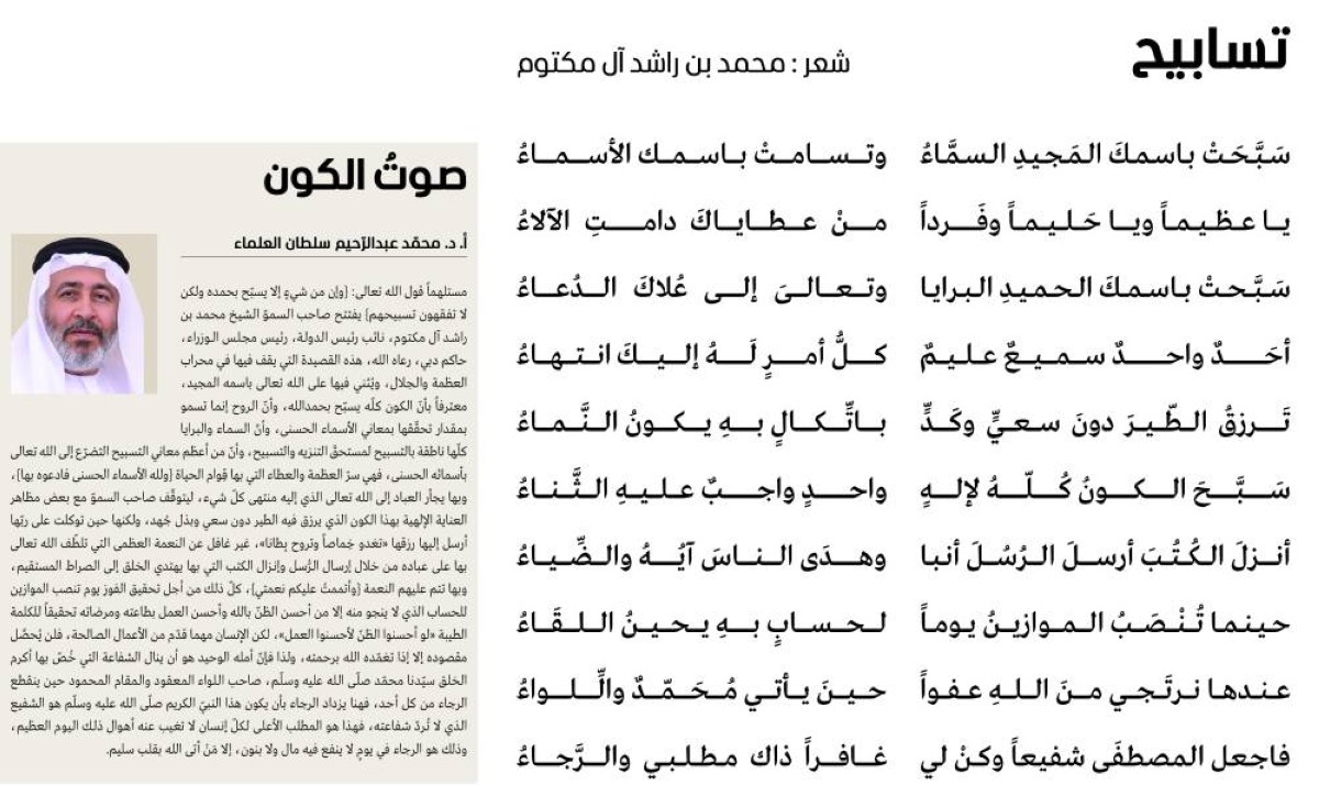 مستلهماً قول الله تعالى: {وإن من شيءٍ إلا يسبّح بحمده ولكن لا تفقهون تسبيحهم} يفتتح صاحب السموّ الشيخ محمّد بن راشد آل مكتوم، نائب رئيس الدولة، رئيس مجلس الوزراء، حاكم دبي، رعاه الله، هذه القصيدة التي يقف فيها في محراب العظمة والجلال، ويُثني فيها على الله تعالى باسمه المجيد، معترفاً بأنّ الكون كلّه يسبّح بحمد الله، وأنّ الروح إنما تسمو بمقدار تحقّقها بمعاني الأسماء الحسنى، وأنّ السماء والبرايا كلّها ناطقة بالتسبيح لمستحقّ التنزيه والتسبيح، وأنّ من أعظم معاني التسبيح التضرّع إلى الله تعالى بأسمائه الحسنى، فهي سرّ العظمة والعطاء التي بها قِوام الحياة {ولله الأسماء الحسنى فادعوه بها}، وبها يجأر العباد إلى الله تعالى الذي إليه منتهى كلّ شيء، ليتوقّف صاحب السموّ مع بعض مظاهر العناية الإلهية بهذا الكون الذي يرزق فيه الطير دون سعي وبذل جُهد، ولكنها حين توكلت على ربّها أرسل إليها رزقها «تغدو خِماصاً وتروح بِطانا»، غير غافل عن النعمة العظمى التي تلطّف الله تعالى بها على عباده من خلال إرسال الرُّسل وإنزال الكتب التي بها يهتدي الخلق إلى الصراط المستقيم، وبها تتم عليهم النعمة {وأتممتُ عليكم نعمتي}، كلّ ذلك من أجل تحقيق الفوز يوم تنصب الموازين للحساب الذي لا ينجو منه إلا من أحسن الظنّ بالله وأحسن العمل بطاعته ومرضاته تحقيقاً للكلمة الطيبة «لو أحسنوا الظنّ لأحسنوا العمل»، لكن الإنسان مهما قدّم من الأعمال الصالحة، فلن يُحصِّل مقصوده إلا إذا تغمّده الله برحمته، ولذا فإنّ أمله الوحيد هو أن ينال الشفاعة التي خُصّ بها أكرم الخلق سيّدنا محمّد صلّى الله عليه وسلّم، صاحب اللواء المعقود والمقام المحمود حين ينقطع الرجاء من كل أحد، فهنا يزداد الرجاء بأن يكون هذا النبيّ الكريم صلّى الله عليه وسلّم هو الشفيع الذي لا تُردّ شفاعته، فهذا هو المطلب الأعلى لكلّ إنسان لا تغيب عنه أهوال ذلك اليوم العظيم، وذلك هو الرجاء في يومٍ لا ينفع فيه مال ولا بنون، إلا مَنْ أتى الله بقلب سليم.