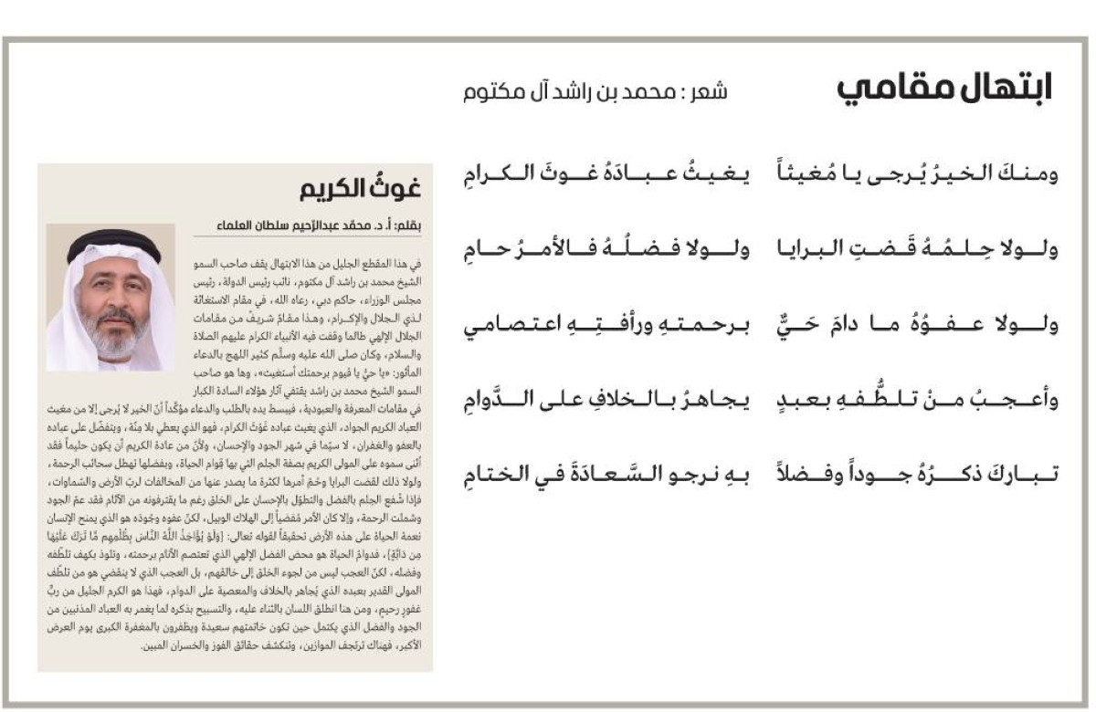«يا حيُّ يا قيوم برحمتك أستغيث»، وها هو صاحب السمو الشيخ محمد بن راشد يقتفي آثار هؤلاء السادة الكبار في مقامات المعرفة والعبودية، فيبسط يده بالطلب والدعاء مؤكِّداً أنّ الخير لا يُرجى إلا من مغيث العباد الكريم الجواد، الذي يغيث عباده غَوْثَ الكرام، فهو الذي يعطي بلا مِنّة، ويتفضّل على عباده بالعفو والغفران، لا سيّما في شهر الجود والإحسان، ولأنّ من عادة الكريم أن يكون حليماً فقد أثنى سموه على المولى الكريم بصفة الحِلم التي بها قِوام الحياة، وبفضلها تهطل سحائب الرحمة.
