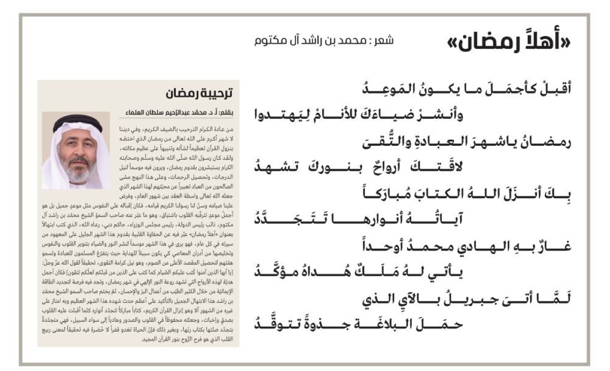 وهو ما عبّر عنه صاحب السموّ الشيخ محمّد بن راشد آل مكتوم، نائب رئيس الدولة، رئيس مجلس الوزراء، حاكم دبي، رعاه الله، الذي كتب ابتهالاً بعنوان «أهلاً رمضان» عبَّر فيه عن الحفاوة القلبية بقدوم هذا الشهر الجليل على المعهود من سيرته في كل عام.
