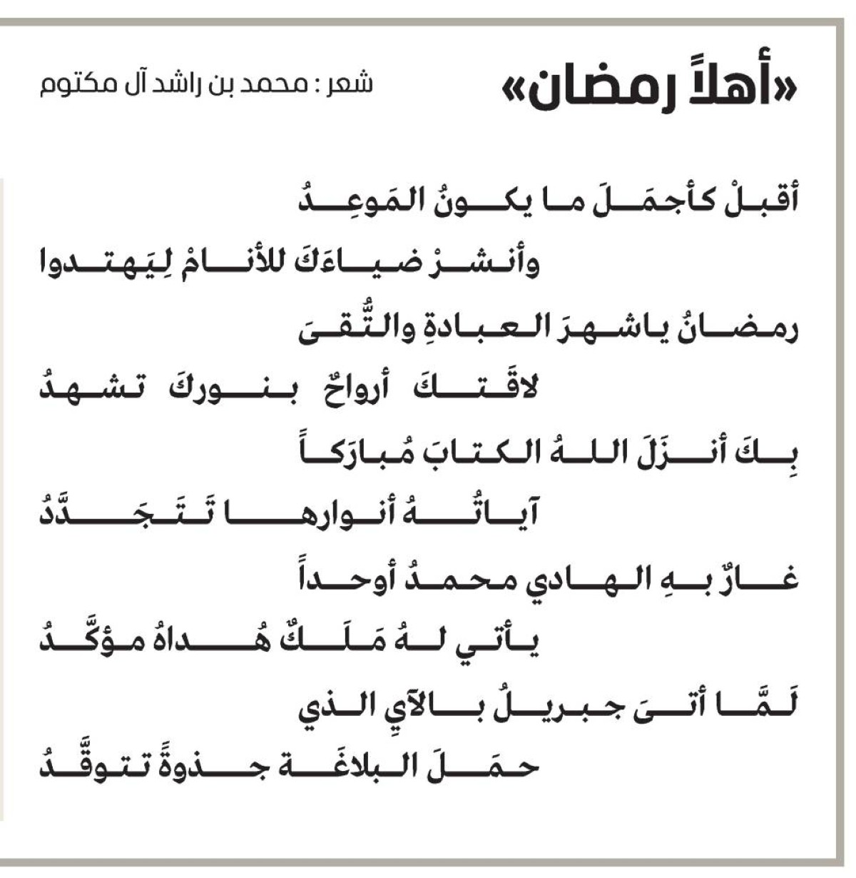 وتجد فيه فرصة لتجديد الطاقة الإيمانيّة من خلال الكثير الطيّب من أعمال البرّ والإحسان، ثمّ يختم صاحب السمو الشيخ محمّد بن راشد هذا الابتهال الجميل بالتأكيد على أعظم حدث شهده هذا الشهر العظيم وبه امتاز على غيره من الشهور ألا وهو إنزال القرآن الكريم، كتاباً مباركاً تتجدّد أنواره كلما أقبلت عليه القلوب بصدقٍ وإخبات، وجعلته محفوظاً في القلوب والصدور وهادياً إلى سواء السبيل، فهي متجدّدةٌ بتجدّد صلتها بكتاب ربّها، وبغير ذلك فإنّ الحياة تغدو قفراً لا خُضرة فيه تحقيقاً لمعنى ربيع القلب الذي هو فرح الرُّوح بنور القرآن المجيد.