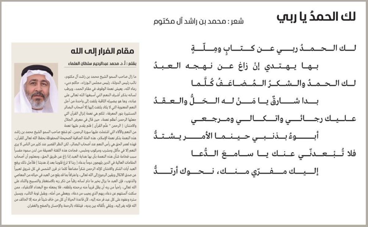 ما زال صاحب السمو الشيخ محمد بن راشد آل مكتوم، نائب رئيس الدولة، رئيس مجلس الوزراء، حاكم دبي، رعاه الله، يعيش نعمة الوقوف في مقام الحمد، ويرطب لسانه بذكر أشرف النعم التي أسبغها الله تعالى على عباده، وها هو ببصيرته الثاقبة يلتفت إلى واحدة من أجل النعم المعنوية التي لا يكاد يلتفت إليها إلا أصحاب البصائر المستنيرة بنور المعرفة، تلكم هي نعمة إنزال القرآن التي جعلها الرحمن أعظم نعمة، حين قال في معرض الجلال والامتنان: { الرحمن * علّم القرآن } فلم يقدم عليها نعمة من النعم والآلاء التي اشتملت عليها سورة الرحمن، ثم شفع صاحب السمو الشيخ محمد بن راشد هذه النعمة بذكر نعمة الإسلام، هذه الملة الصافية الصحيحة المحفوظة بحفظ الله تعالى للقرآن، فهذه لعمر الحق هي رأس النعم عند أصحاب البصائر، لكن النظر القصير عند كثير من الناس لا يرى النعم إلا في مأكل ومشرب ومركوب وملبس، فجاءت هذه اللفتة العميقة من لدن سموه مفسراً سبب فخامة شأن هذه النعمة بأن بها هداية العبد إذا زاغ عن طريق الحق، ومعلوم أن أصحاب المقامات العالية في الدين يلهجون دوماً بدعاء { ربنا لا تزغ قلوبنا بعد إذ هديتنا } فلأجل ذلك يرفع العبد آيات الشكر والامتنان للإله الرحمن شكراً مضاعفاً كلما ذر قرن الشمس في كل شروق تعبيراً عن صدق الاتكال ويقين الرجوع إلى الله تعالى، واعترافاً بما قد يقع من العبد في حياته من المعاصي والذنوب، فإن العبد ما يزال بخير ما دام لسانه رطباً من ذكر ربه بالاستغفار والتسبيح والثناء على الله تعالى، راجياً من ربه أن يظل قريباً منه برحمته ولطفه، فلا يجعله مع البعداء الأشقياء، ممن سكتت ألسنتهم عن دعاء ربهم الذي يجيب من دعاه، ويعطي من أمله، ويقبل توبة التائب، ويسبل ستره وعفوه على كل عبد فر منه إليه، لأن قاعدة الحياة أن كل من خاف شيئاً فر منه إلا الخائف من الله فإنه يفر إليه، ويلقي بأثقاله بين يديه، فيتلقاه بالرحمة والإحسان والصفح والغفران.