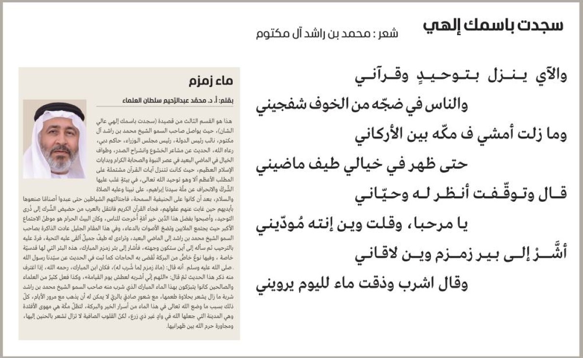 هذا هو القسم الثالث من قصيدة (سجدت باسمك إلهي عالي الشان)، حيث يواصل صاحب السمو الشيخ محمد بن راشد آل مكتوم، نائب رئيس الدولة، رئيس مجلس الوزراء، حاكم دبي، رعاه الله، الحديث عن مشاعر الخشوع وانشراح الصدر، وطواف الخيال في الماضي البعيد في عصر النبوة والصحابة الكرام وبدايات الإسلام العظيم، حيث كانت تتنزل آيات القرآن مشتملة على المطلب الأعظم ألا وهو توحيد الله تعالى، في بيئةٍ غلب عليها الشِّركُ والانحراف عن ملّة سيدنا إبراهيم، على نبينا وعليه الصلاة والسلام، بعد أن كانوا على الحنيفية السمحة، فاجتالتهم الشياطين حتى عبدوا أصنامًا صنعوها بأيديهم حين غابت عنهم عقولهم، فجاء القرآن الكريم فانتقل بالعرب من حضيض الشِّرك إلى ذُرى التوحيد، وأصبحوا بفضل هذا الدِّين خير أمّةٍ أُخرجت للناس، وكان البيتُ الحرام هو موطنُ الاجتماع الأكبر حيث يجتمع الملايين وتضجّ الأصوات بالدعاء، وفي هذا المقام الجليل عادت الذاكرة بصاحب السمو الشيخ محمد بن راشد إلى الماضي البعيد، وتراءى له طيفٌ جميلٌ ألقى عليه التحية، فردّ عليه بالترحيب ثم سأله إلى أين ستكون وجهته، فأشار إلى بئر زمزم المبارك، هذه البئر التي لها قدسيّة خاصة ، وفيها نوعٌ خاصٌّ من البركة تُقضى به الحاجات كما ثبت في الحديث عن سيّدنا رسول الله ــ صلى الله عليه وسلم ــ أنه قال: (ماءُ زمزم لِما شُرب له)، فكان ابن المبارك، رحمه الله، إذا اغترف منه ذكر هذا الحديث ثمّ قال: «اللهم إنّي أشربه لعطش يوم القيامة»، وكذا فعل كثيرٌ من العلماء والصالحين كانوا يتبرّكون بهذا الماء المبارك الذي شرب منه صاحب السمو الشيخ محمد بن راشد شربة ما زال يشعر بحلاوة طعمها، مع شعورٍ صادقٍ بالريّ لا يمكن له أن يذهب مع مرور الأيام، كلّ ذلك بسبب ما وضع الله تعالى في هذا الماء من أسرار الخير والبركة، لتظلّ مكّة هي مهوى الأفئدة وهي المدينة التي جعلها الله في وادٍ غير ذي زرع، لكنّ القلوب الصافية لا تزال تشعر بالحنين إليها، ومجاورة حرم الله بين ظهرانيها.