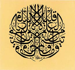 (وما أوتيتم من العلم إلا قليلا ) ...(الإسراء 85) بخط الثلث الجلي المركب بشكل متناظر، فكون شكلا دائرياً جميلاً، وقد وفق هاشم في توزيع الحروف والمقاطع على المساحة المتاحة بعدالة وحسن اختيار في مواقع التشابك. نأخذ كل حرف نصيبه المقسوم له، فتحاشى الإظلام فيما بين الحروف.