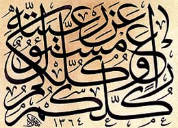 واللوحة هنا: (كلكم راعٍ وكلكم مسؤول عن رعيته) حديث نبوي شريف: كتب حقي النص بالثلث الجلي فأجاد في توزيع الكتل اللونية بعدالة دون المساس بنسب الحروف، وأجمل ما فيها الكافات الزنادية التي أبان فيها الخطاط ثبات يده ومكنته في أداء عمله.