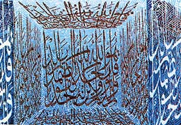 فالفنان مصطفى المتمكن من قواعد الخط العربي وطرزه، يبني لوحته من حشد كبير للحروف والكلمات التي تتوضع ضمن مساحات واسعة، بطريقة التهشير، وبأقل ما يمكن من الألوان، وهذه التشكيلات الحروفية تشغل كامل مساحة اللوحة، إنما باتجاهات مختلفة، وبنوع من التنظيم الهندسي المدروس، الذي يمنح اللوحة إحساساً بالحجم والبعد الثالث، وغالباً ما تأتي تهشيرات الحروف ومساحاتها، فوق أرضية فاتحة مؤلفة من تشكيلات حروفية مكرورة، تبرز التشكيلات الأخرى وتؤكدها. لدى الفنان أحمد مصطفى أيضاً، تجارب أخرى تنتمي إلى التكوينات الحرة، يعتمد فيها على البعد الواحد، وألوانٍ كثيرة، إنما منفذة بنفس الصيغة والأسلوب التراكمي،