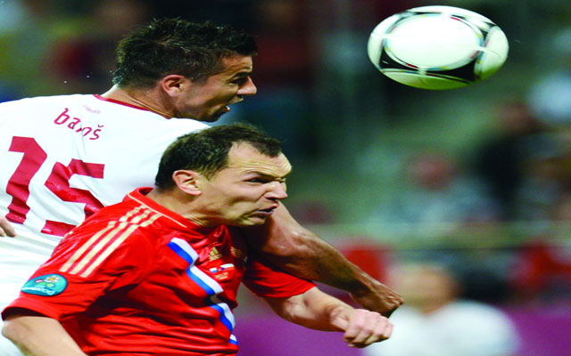 الْتَهم "الدب" الروسي نظيره التشيكي عندما هزمه 4-1 أول من أمس الجمعة في فروكلاف في الجولة الأولى من منافسات المجموعة الأولى لكأس اوروبا لكرة القدم 2012. وسجل الن دزاغوييف (15 و79) ورومان شيروكوف (24) ورومان بافليوتشنكو (82) اهداف روسيا، وفاتشلاف بيلار (52) هدف تشيكيا. وكانت المباراة الافتتاحية ضمن هذه المجموعة انتهت بتعادل بولندا واليونان 1-1، فتصدرت روسيا الترتيب برصيد 3 نقاط مقابل نقطة لكل من بولندا واليونان ولا شيء لتشيكيا.