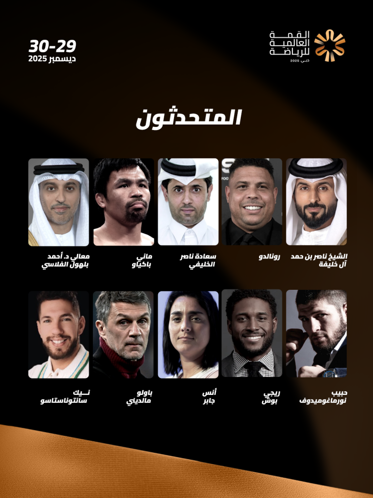 وتشهد القمة مشاركة أكثر من 70 متحدثاً من نخبة القادة والنجوم وأساطير الرياضة العالمية الذين تركوا بصمات مؤثرة في مسيرتهم الرياضية والإنسانية، من بينهم سمو الشيخ ناصر بن حمد آل خليفة، ومعالي الدكتور أحمد بالهول الفلاسي، وسعادة ناصر الخليفي، ورونالدو نازاريو، وباولو مالديني، وحبيب نورمحمدوف، وماني باكياو، وريجي بوش، وأنس جابر، ونيك سانتوناستاسو، إلى جانب شخصيات رياضية أخرى من مختلف دول العالم، ما يعزز مكانة القمة كمنصة عالمية تجمع الخبرة، والتميز، والتجارب الملهمة.
