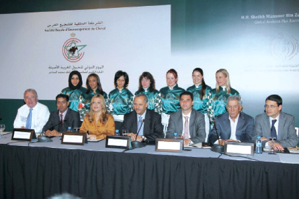 و عقد مؤتمر صحافي امس بفندق غراند حياة بالدار البيضاء بحضور العصري سعيد الظاهري سفير الدولة لدى المملكة المغربية، ولارا صوايا مديرة مهرجان سمو الشيخ منصور بن زايد آل نهيان العالمي للخيول العربية رئيسة السباقات النسائية بالاتحاد الدولي لسباقات الخيول العربية (ايفار)، وعمر سكالي مدير عام شركة الملكية لتشجيع الفروسية، واسماعيل ناصف رئيس جمعية الخيول في الدار البيضاء .