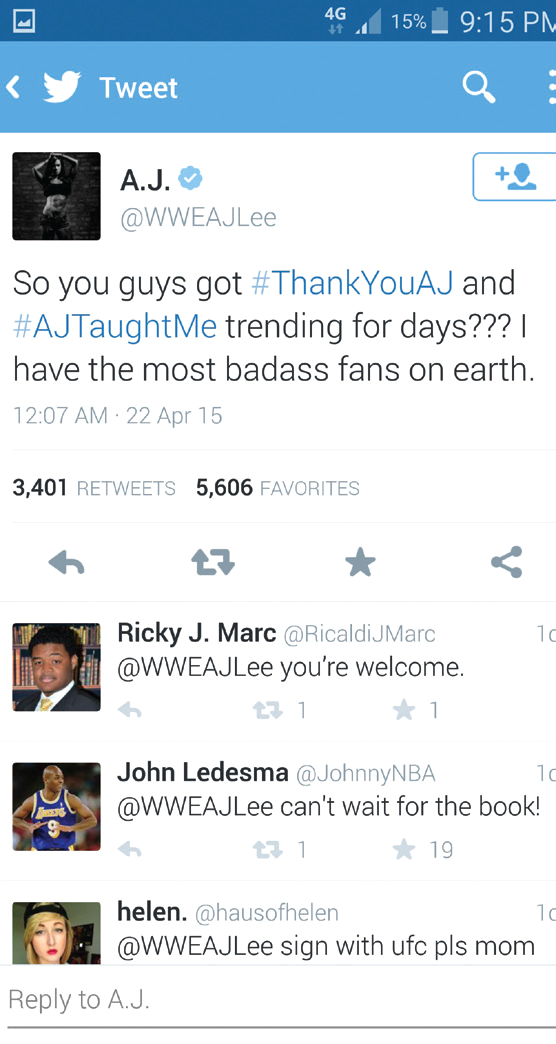 نشرت النجمة والمصارعة السابقة لـ WWE أي جي تغريدة عبر مواقع التواصل الاجتماعي «تويتر»، تشكر فيها مشجعيها حول العالم بعد خبر اعتزالها النهائي عن حلبات المصارعة الحرة. يرجع السبب لهذه التغريدة هو تتداول هاشتاغ «شكراً أي جي» عالمياً على مدار الأيام الماضية.