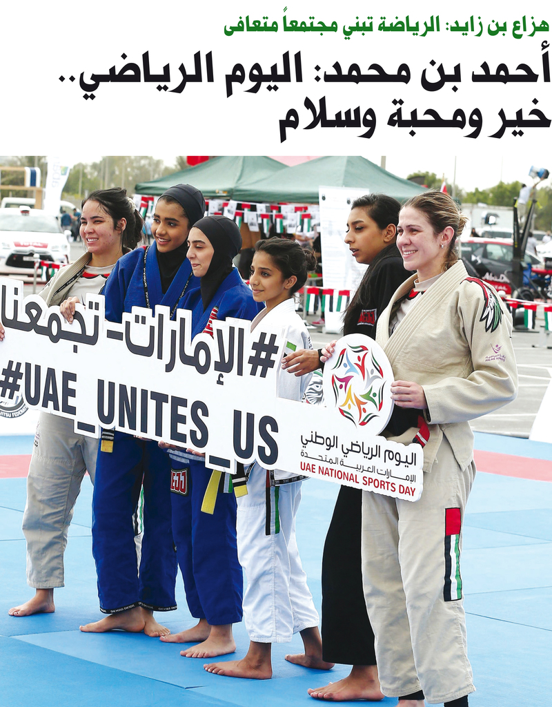 وقال سموه: «ندعو عموم فئات المجتمع إلى المشاركة في فعاليات اليوم الرياضي الوطني، الذي يقام للعام الثاني على التوالي بمبادرة حكيمة من صاحب السمو الشيخ محمد بن راشد آل مكتوم، نائب رئيس الدولة رئيس مجلس الوزراء حاكم دبي، رعاه الله، تحت شعار «الإمارات تجمعنا»، هذا الشعار الذي يجسد الواقع الذي نعيشه يومياً هنا في إمارات المحبة والسلام».