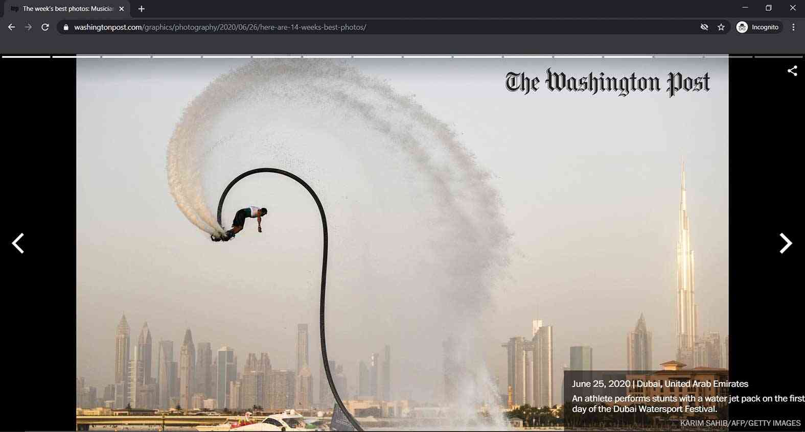 ونشرت "واشنطن بوست)"الأمريكية، عبر موقعها الإلكتروني، صورة المصور العالمي العراقي كريم صاحب، ضمن أفضل اللقطات حول العالم في الأسبوع، حيث أبدع كريم في التقاط صورة لبطل الإمارات مروان المرزوقي وهو يقوم بإحدى الحركات الاستعراضية في رياضة الألواح المائية الطائرة بشاطئ الشروق وخلفه مشهد رائع للمعلم الحضاري الكبير وأعلى بناء شيده الإنسان (برج خليفة) مع لحظات الغروب.