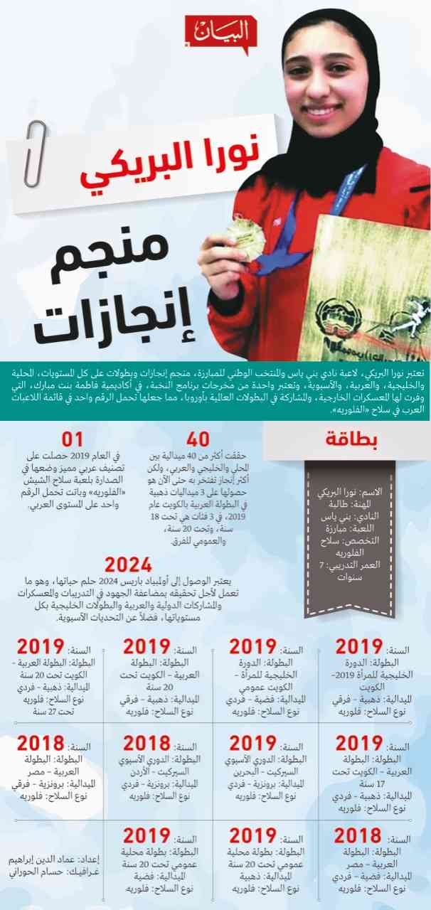 تعتبر نورا البريكي، لاعبة نادي بني ياس والمنتخب الوطني للمبارزة، منجم إنجازات وبطولات على كل المستويات، المحلية والخليجية، والعربية، والآسيوية، وتعتبر واحدة من مخرجات برنامج النخبة، في أكاديمية فاطمة بنت مبارك، التي وفرت لها المعسكرات الخارجية، والمشاركة في البطولات العالمية بأوروبا، مما جعلها تحمل الرقم واحد في قائمة اللاعبات العرب في سلاح «الفلوريه».فيما يلي تعريف بها وبأهم إنجازاتها في كافة المحافل الرياضية ممثلة الإمارت في لعبة المبارزة: