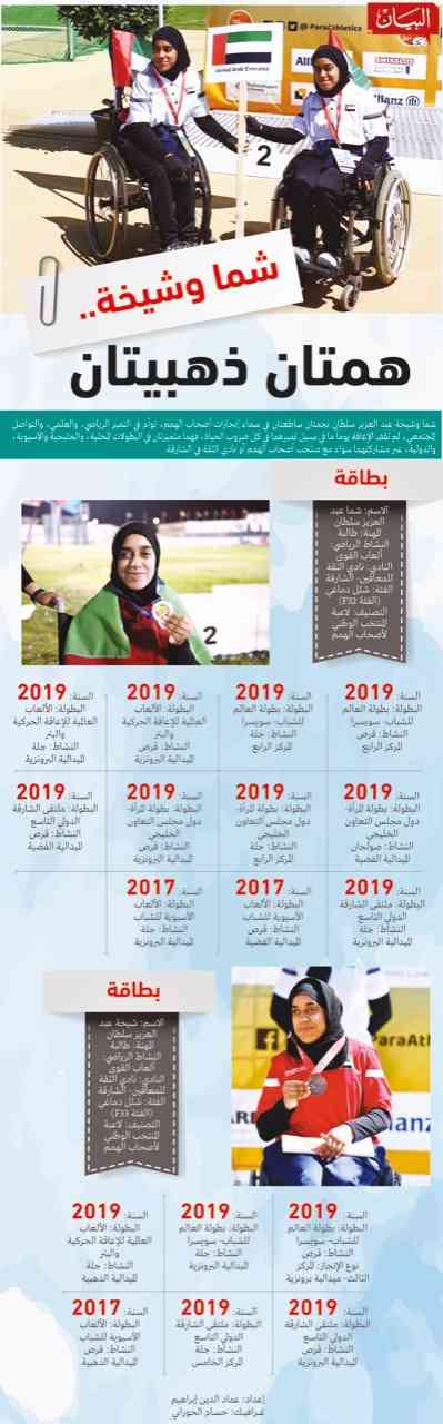 شما وشيخة عبد العزيز سلطان نجمتان ساطعتان في سماء إنجازات أصحاب الهمم، توأم في التميز الرياضي، والعلمي، والتواصل المجتمعي، لم تقف الإعاقة يوماً ما في سبيل تميزهما في كل ضروب الحياة، فهما متميزتان في البطولات المحلية، والخليجية والآسيوية، والدولية، عبر مشاركتهما سواء مع منتخب أصحاب الهمم أو نادي الثقة في الشارقة، فيما يلى نسلط الضوء على مسيرتهما الاحترافية .
