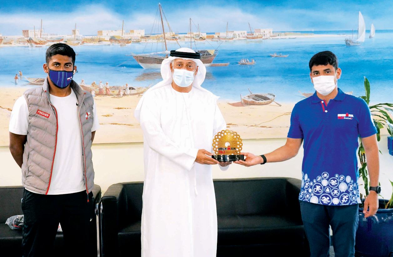وتسلم محمد عبدالله حارب المدير التنفيذي لنادي دبي الدولي للرياضات البحرية الدرع التكريمية من إسماعيل الجسمي مدير مسار السباحة وعبدالله يوسف الأملح مساعد المدير وذلك في مقر النادي.