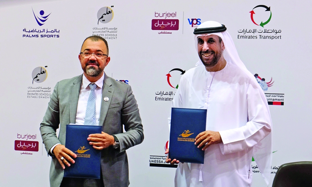وقّع عبيد حميد القعود نائب رئيس اتحاد الإمارات للرياضة المدرسية، وفؤاد درويش الرئيس التنفيذي لشركة بالمز الرياضية، مذكرة تعاون بين «الاتحاد وبالمز»، جاء ذلك خلال مؤتمر صحافي بحضور لبنى الشامسي المدير التنفيذي لقطاع العمليات المدرسية لمؤسسة الإمارات للتعليم، وعائشة الصيري الأمين العام للاتحاد، ويستهدف التعاون تعزيز مهارات الطلبة بالألعاب الرياضية مثل الجوجيتسو والسباحة والفنون القتالية المختلطة.
