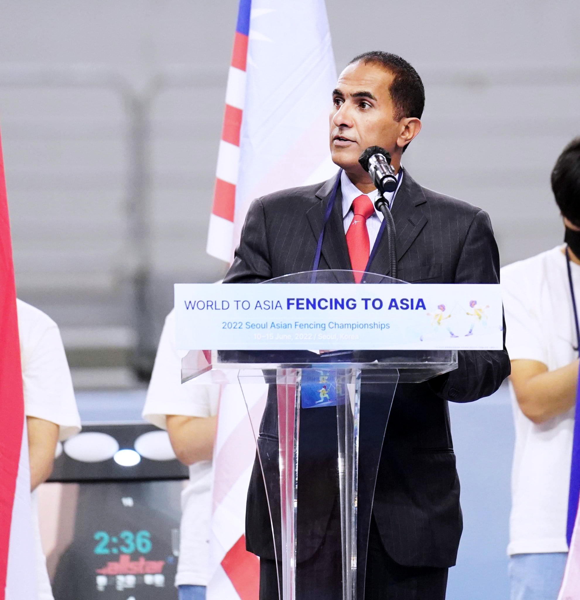وفي كلمته الافتتاحية، شكر المهندس الشيخ سالم بن سلطان القاسمي، الدولة الكورية، لاستضافتها البطولة، مؤكداً على أن الاتحاد الآسيوي يشهد طفرة غير مسبوقة في إقامة بطولاته، التي حرص على تنظيمها، متجاوزاً كافة التحديات التي شهدها العالم مؤخراً، حيث استطاع بنجاح، تنظيم بطولة الشباب والناشئين بأوزبكستان، خلال شهر مارس الماضي، وقبلها كان تنظيم اختبارات الحكام الدوليين الآسيويين، التي استضافتها دبي، نهاية فبراير الماضي. الأمر الذي يؤكد على رغبة أسرة المبارزة الآسيوية على المضي قدماً في سبيل تطوير ورفعة المبارزة الآسيوية.