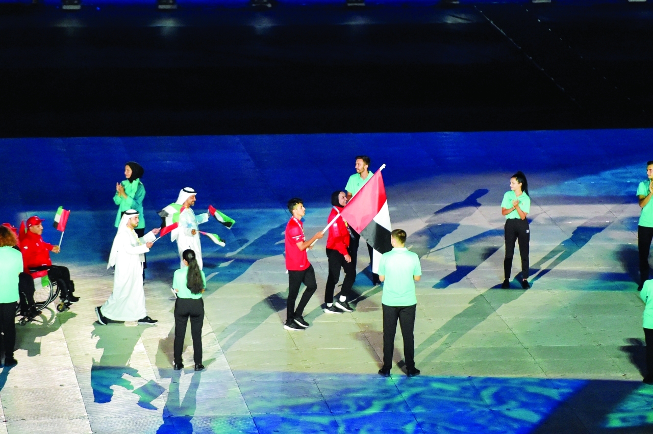 وحمل علم الإمارات في حفل الافتتاح ثنائي منتخبنا الوطني للدراجات الهوائية يوسف ميرزا وصفية الصايغ.