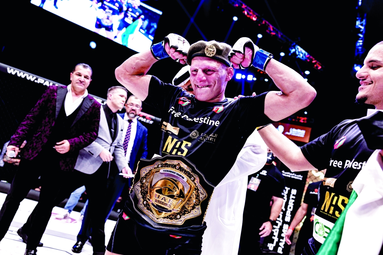 أجبر البطل العربي الأردني علي القيسي منافسه الكندي جيسي أرنيت على الاستسلام، في الجولة الثالثة من أصل خمس جولات، ليتوج بذلك بلقب وزن الريشة في دولية بطولة «محاربي الإمارات» للفنون القتالية المختلطة، في نسختها الـ 33 التي أقيمت مساء أول من أمس، على صالة الاتحاد أرينا في أبوظبي، وسط حضور جماهيري غفير جاء لمتابعة النزالات الدولية وفي مقدمتها مواجهة القيسي - أرنيت.