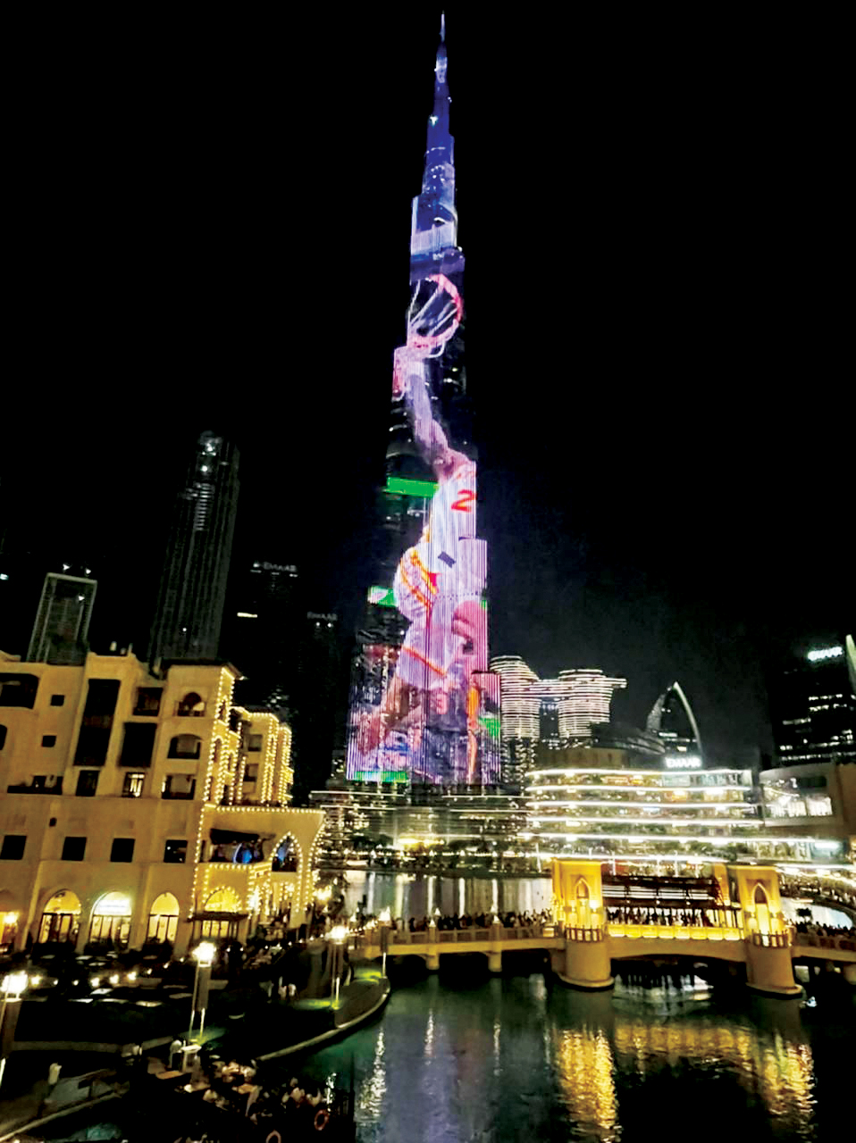 نظمت دائرة الثقافة والسياحة - أبوظبي والرابطة الوطنية لكرة السلة الأمريكية عرضاً بصرياً على برج خليفة احتفالاً بإطلاق العد التنازلي لمباريات دوري كرة السلة الأمريكي لمحترفين «NBA» وتصاعد حماس الجمهور مع ظهور شعار المباريات، التي تستضيفها العاصمة الإماراتية للمرة الأولى في منطقة الخليج العربي، على برج خليفة، مصحوباً بعرض ضوئي مذهل. وتألقت أيضاً ساعة العد التنازلي تحت أضواء الليزر الملونة على جدران أطول مبنى بالعالم، في حدث استثنائي سيشكل علامة فارقة في تاريخ أحد أكثر الدوريات الرياضية متابعة على الساحة الدولية.
