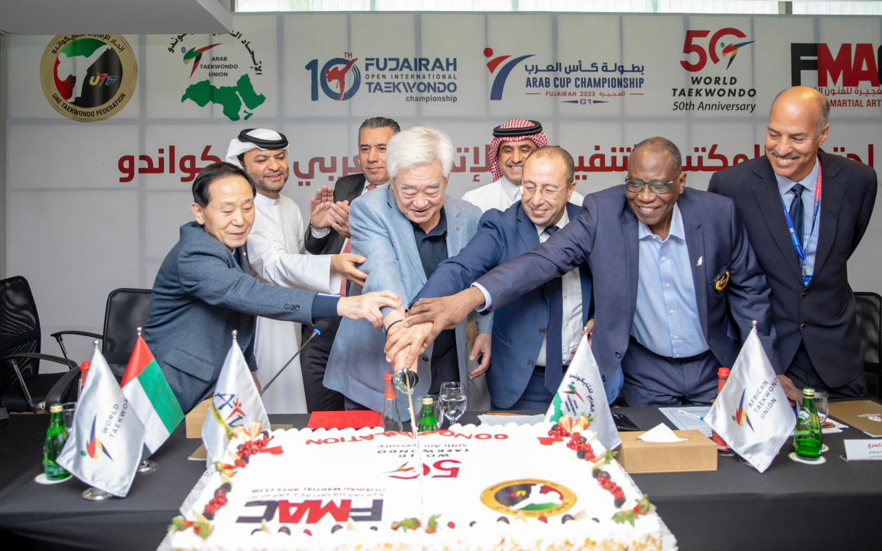 من جانبه، شكر الدكتور أحمد حمدان الزيودي، رئيس اتحاد الإمارات للتايكواندو، واللجنة المنظمة العليا للبطولة، الحضور على الدعم المستمر للبطولات التي يستضيفها نادي الفجيرة للفنون القتالية، خصوصاً مع تزامن احتفال الفجيرة بمرور عشرة أعوام على انطلاقة البطولة في عام 2013، مثمناً الجهود الكبيرة التي تبذلها طواقم اللجنة المنظمة للوصول بالبطولة إلى أعلى المستويات. كما تخلل نهاية الاجتماع احتفال الاتحاد العربي للتايكواندو بمناسبة مرور 50 عاماً على تأسيس الاتحاد الدولي للتايكواندو، بحضور الدكتور تشونج وون شوي، رئيس الاتحاد الدولي، والوفد المرافق له.