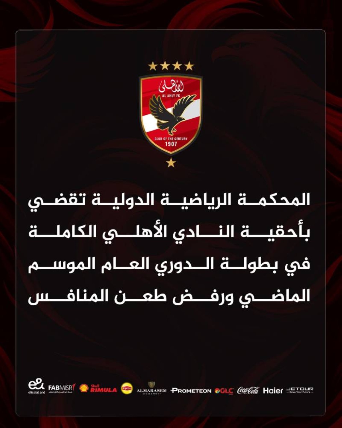 وأضاف الأهلي في بيان على حسابه على منصة إكس "المحكمة الرياضية الدولية تقضي بأحقية النادي الأهلي الكاملة في بطولة الدوري العام الموسم الماضي ورفض طعن المنافس".