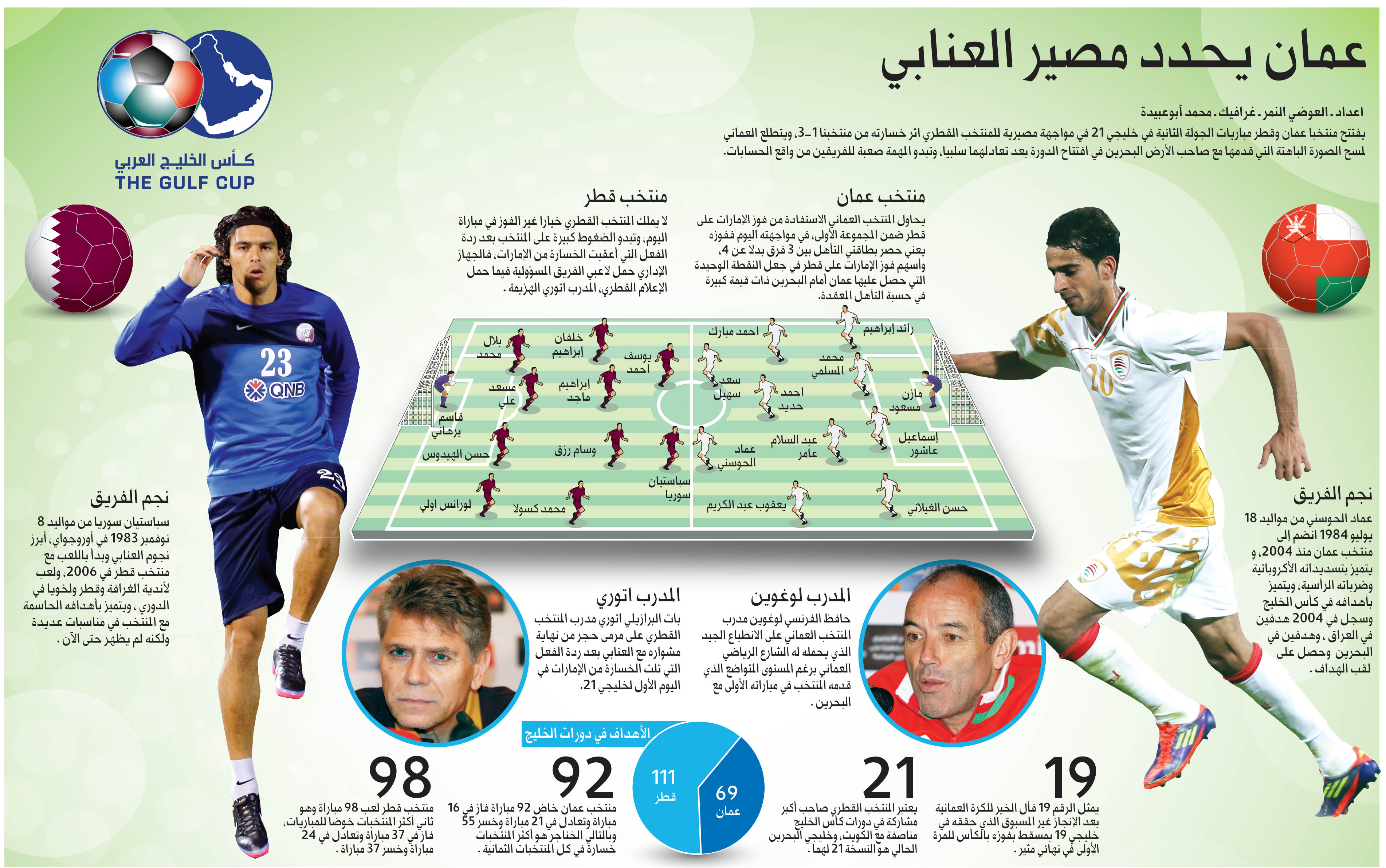 يلتقي في الخامسة والربع مساء اليوم بتوقيت الإمارات منتخبا قطر وعمان ضمن منافسات المجموعة الأولى ، ويسعى العنابي إلى التعويض ومصالحة جماهيره بعد الخسارة الثقيلة أمام الأبيض في الجولة الأولى 1-3، والتي وضعت المنتخب في دائرة قوية جدا من الضغوط خصوصا الإعلامية منها، بجانب الشكوك في إمكانية مواصلة الفريق مشواره في المنافسة ، كما خسر المنتخب القطري سندا مهما جدا وهو إعلام بلاده الذي شن هجوما لاذعا عليه وعلى مدربه البرازيلي باولو اوتوري، ونال الأخير نصيبا وافرا من الانتقادات، بسبب تبديلاته غير المقنعة ، وغياب الهوية الواضحة للفريق والأسلوب المناسب للمواجهة، إلى حد مطالبة البعض ب"محاكمته".