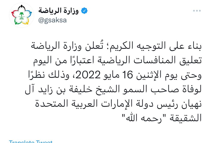 قررت وزارة الرياضة السعودية تعليق المنافسات الرياضية اعتبارًا من اليوم وحتى يوم 16 مايو الجاري حداداً على وفاة المغفور له الشيخ خليفة بن زايد رحمه الله