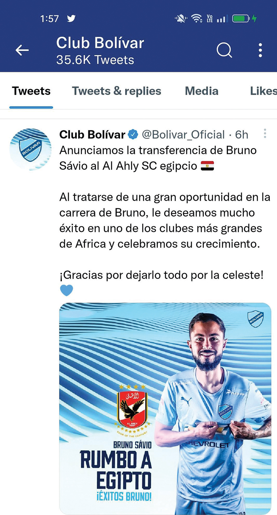 وأعلن نادي بوليفار البوليفي عبر صفحته الرسمية على «تويتر»، انتقال لاعبه البرازيلي برونو سافيو (28 عامًا)، إلى الفريق الأحمر بشكل رسمي، وكتب: «انتقال سافيو إلى الأهلي، مؤكدًا أنها فرصة عظيمة في مسيرته. نتمنى له كل النجاح في واحد من أكبر أندية أفريقيا، شكرًا على كل ما قدمته لنا».