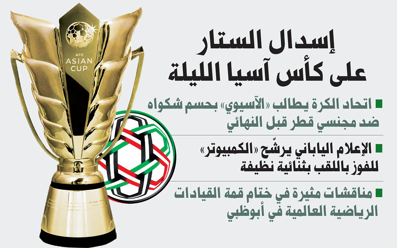 طالب اتحاد الكرة لجنة الانضباط بالاتحاد الآسيوي، بضرورة حسم شكواه على عدم قانونية مشاركة اثنين من لاعبي قطر خلال مباراة الفريقين سوياً في الدور نصف النهائي، وهما المهاجم المعز علي (22 عاماً)، المولود في السودان، ومتصدر ترتيب هدافي البطولة (8)، والمدافع بسام الراوي (21 عاماً)، المولود في العراق، قبل إقامة المباراة النهائية للبطولة، والتي ستقام مساء اليوم بين اليابان وقطر، تطبيقاً للمساواة والعدالة الناجزة، ومنح كل طرف حقه، وترسيخاً لمبدأ العدالة، حتى لا يتضرر الطرف الشاكي من شكواه.