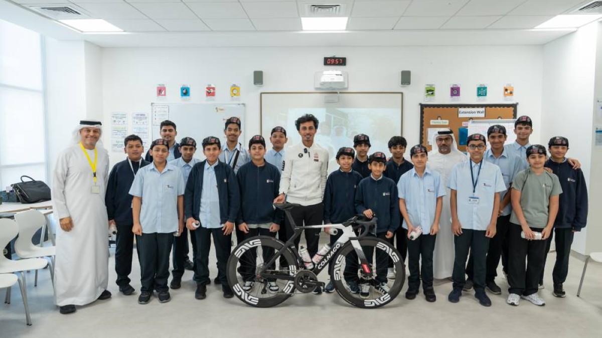 وخلال الجلسة، شارك البطل يوسف ميرزا الطلاب تجربته ومسيرته الرياضية المتميزة، مستعرضاً أهم محطاته وإنجازاته في عالم الدراجات الهوائية، في أجواء تفاعلية حفّزت الطلاب على طرح الأسئلة حول الرياضة وأهمية الالتزام والطموح.