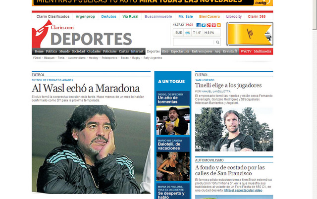 انتشر خبر إنهاء عقد لاعب كرة القدم دييغو مارادونا مع نادي "الوصل" بسرعة مدهشة في مختلف وسائل الإعلام الناطقة باللغة الإسبانية في كل من الارجنتين وإسبانيا، وخصته بمساحات واسعة متصدراً صفحاتها الرياضية، فقد نشرت صحيفة "كلارين" الأرجنتينية على صدر صفحتها الرياضية صورة للأسطورة يبدو فيها متأملاً وشارد الذهن ويده على خده مع مسحة حزن بادية على وجهه إثر تلقيه نبأ فسخ العقد بينه وبين فريق الوصل، وذلك تحت عنوان مثير هو "الوصل يطرد مارادونا" وعنوان آخر فرعي يقول:" النادي اتخذ القرار المفاجئ هذا المساء، مع أنه ثبته قبل أقل من شهر بوصفه مدرباً للموسم المقبل".