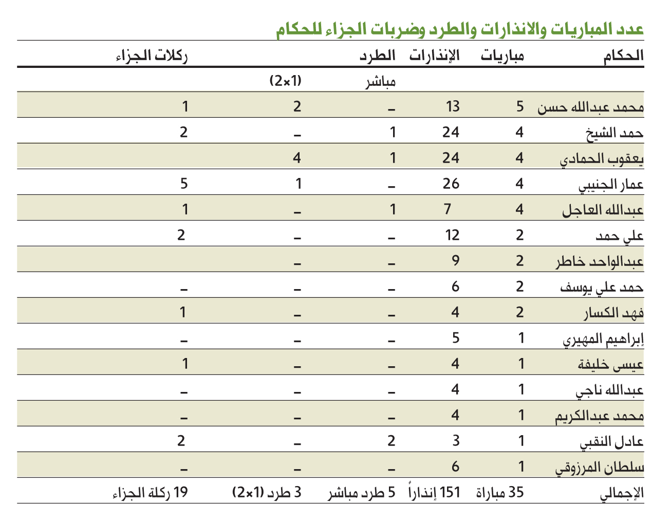 عدد المباريات والانذارات والطرد وضربات الجزاء للحكام (احصائية)