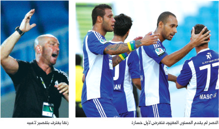 اعترف الإيطالي والتر زنغا المدير الفني لفريق النصر أن فريقه لم يظهر في مستوى جيد أمام بني ياس، وافتقد اللاعبون التركيز خاصة في الجزء الأخير من المباراة، مؤكداً أنه يجب طي هذه الصفحة ونسيان الهزيمة والاستعداد إلى العودة بقوة مرة أخرى من أجل تقديم المستوى المعهود للفريق.