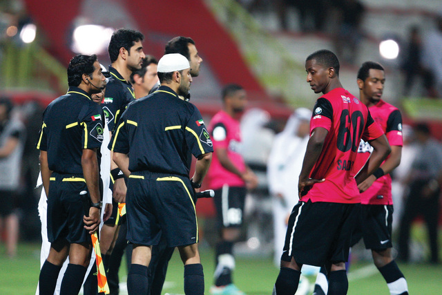 شهدت الدقيقة 90 من مباراة الأهلي وضيفه العين أمس في الجولة الـ 14 المؤجلة من دوري المحترفين، أحداثاً مؤسفة أسفرت عن إيقافها من قبل حكم المباراة حمد الشيخ نتيجة إصابة مساعده الثاني محمد الجلاف في رأسه بعد رميه بجسم صلب من قبل أحد مشجعي الفرسان؛ اعتراضاً على عدم احتساب ركلة جزاء يعتقد ذلك المشجع أن فريقه الأحمر يستحقها بعد إعثار لاعب الأهلي عدنان حسين من قبل مدافع العين محمد سالم، في الوقت الذي كانت فيه المباراة تلفظ أنفاسها الأخيرة بالتعادل السلبي بين الفريقين.