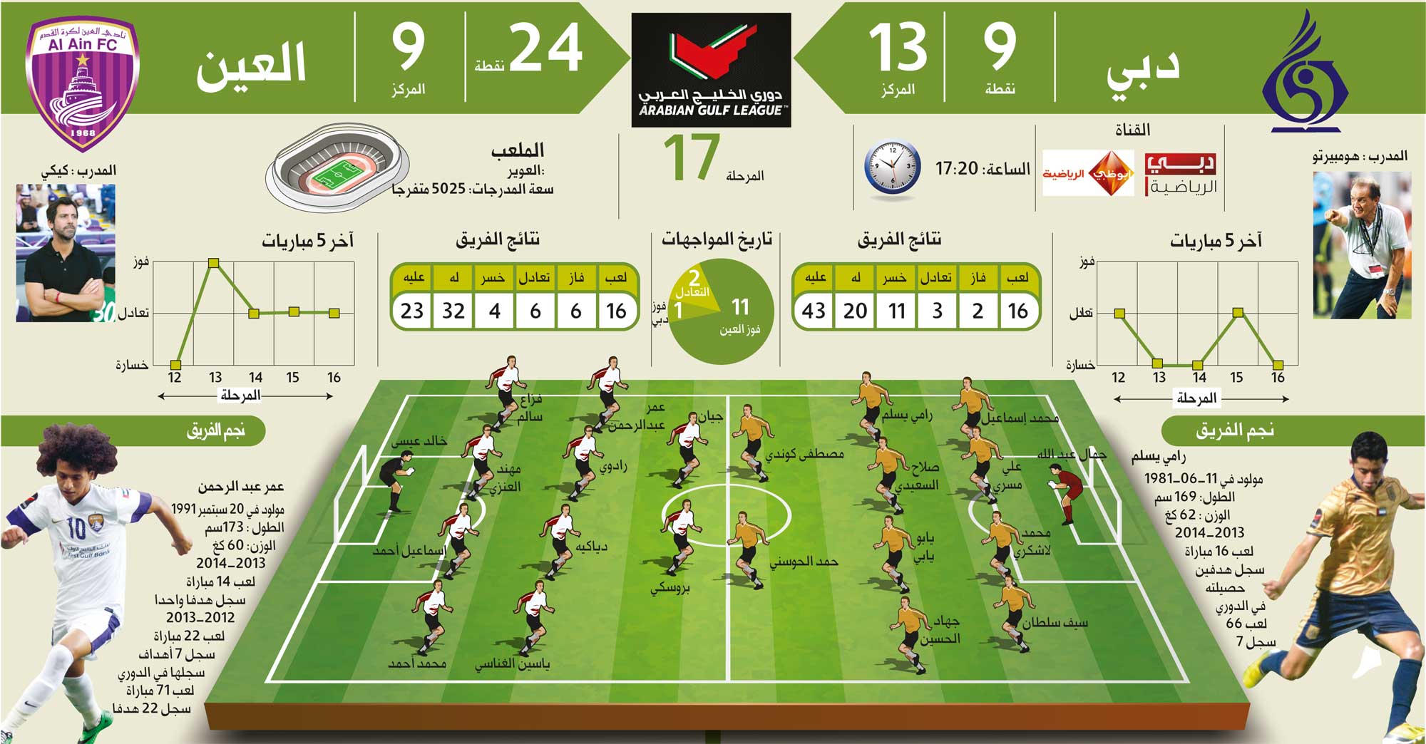 وتتناسب مع أهمية المباراة، ومواجهة القوة الهجومية للعين، إذ يرغب دبي في تخطي هذه العقبة، من أجل تحسين موقفه الحرج في جدول ترتيب المسابقة. كما ستكون هناك تكليفات خاصة للثنائي المالي مصطفى كوندي، والمغربي صلاد السعيدي اللذين بدآ في الانسجام مع زملائهما بالفريق خلال الأيام الماضية، وتعول عليهما جماهير دبي كثيراً خاصة، ليكونا خير عوض للثنائي تراوري وسيزار اللذين خرجا من قائمة الفريق في الميركاتو الشتوي..