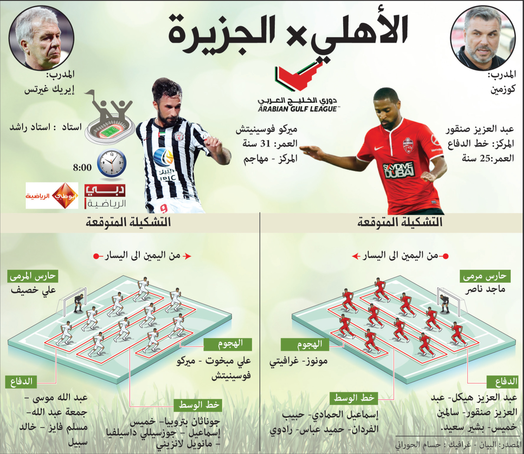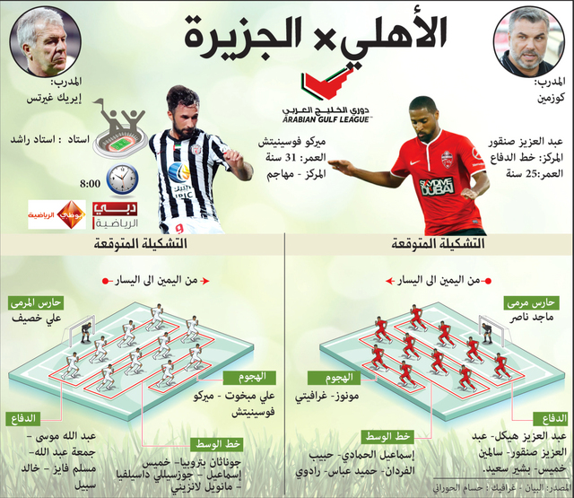 لن تكون قمة الجولة السادسة، سهلة على الفريقين، في ظل تسلح الجزيرة بطموح استعادة اللقب الذي لم يحرزه منذ 2011، ومواصلة الانتصارات وبقدرات المهاجم المتألق ميركو فوسينيتش متصدر قائمة هدافي الدوري برصيد 10 أهداف، ورغبة الأهلي في استعادة نغمة الفوز، وثقة جماهيره القلقة من تراجع نتائج «الفرسان»، وفقدانهم 7 نقاط خلال الجولات الخمس الأخيرة.