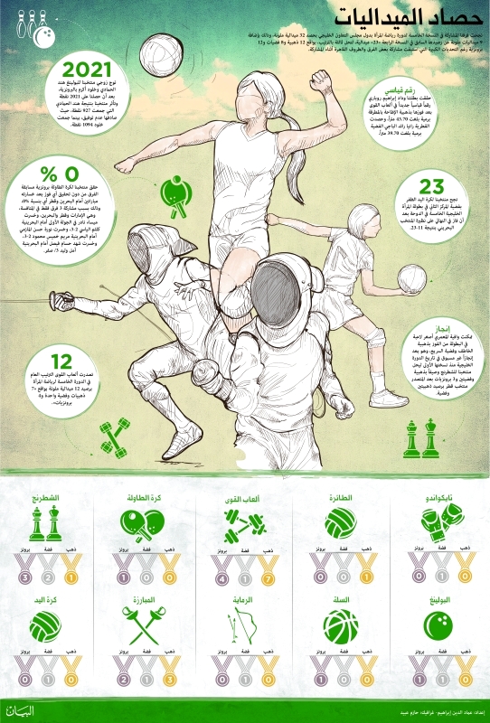 نجحت فرقنا المشاركة في النسخة الخامسة لدورة رياضة المرأة بدول مجلس التعاون الخليجي بحصد 32 ميدالية ملونة، وذلك بإضافة 9 ميداليات ملونة عن رصيدها السابق في النسخة الرابعة «23» ميدالية، لتحل ثالثة بالترتيب، بواقع 12 ذهبية و8 فضيات و12 برونزية رغم التحديات الكبيرة التي استبقت مشاركة بعض الفرق والظروف القاهرة أثناء المشاركة.