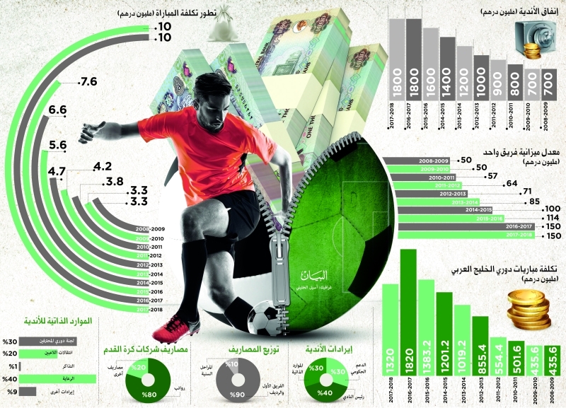 تعيش كرة الإمارات موسمها العاشر في زمن الاحتراف، لكن النتائج المرجوة دون التطلعات في ظل الفجوة بين الإنفاق والإيرادات التي زادت وازدادت عمقاً وخلّفت وراءها عللاً كثيرة تحتاج إلى علاج، حتى لا تتفاقم الخسائر التي ستفوق بنهاية الموسم الحالي أكثر من 12 مليار درهم، لا سيما بعد أن غرقت الأندية في الديون، ودخلت دوامة الاقتراض من البنـوك، وواصلت أسهم التكلفة صعودها نحو أرقام قياسية، لتحتل الإمارات المركز الثاني آسيوياً في حجم الإنفاق خلف الصين متقدمة على السعودية ودول خليجية وعربية أخرى.