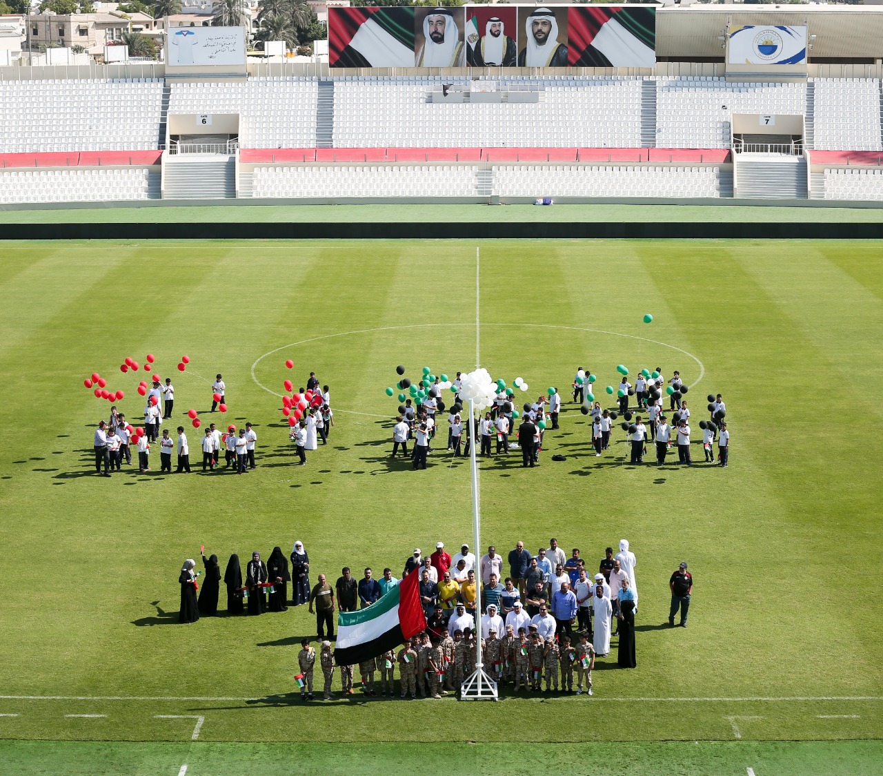 وشهد الاحتفال حضور لاعبي الفريق الأول عبدالله صنقور وحمد جاسم الذين قاموا مع طلاب مدرسة الرشد برفع العلم على الساري أثناء إنشاد النشيد الوطني الإماراتي بمشاركة جميع العاملين في إدارات وشركات نادي الشارقة الرياضي وسط أجواء احتفالية سعد بها طلاب المدرسة وقاموا بإطلاق بالونات بعلم الإمارات في سماء الإستاد.