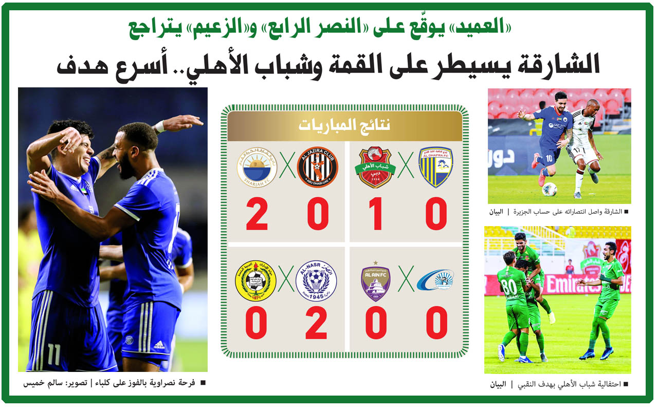 وفي مباراة شباب الأهلي والظفرة منح هدف عبد الله النقبي في الثانية 25 ،والذي يعتبر الأسرع في الموسم الحالي ،شباب الأهلي نقاط المباراة ليرفع الفريق رصيده إلى 16 نقطة منفردا بالمركز الثاني .