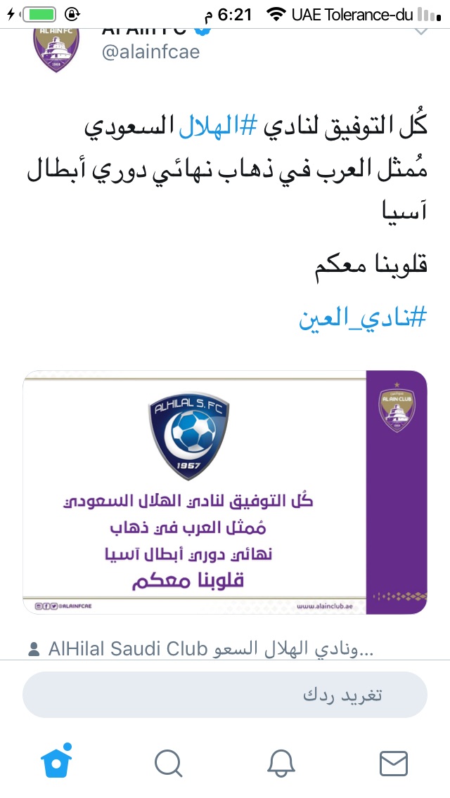 أثارت تغريدة لنادي العين على حسابه الخاص عبر خلالها بالتوفيق لنادي الهلال السعودي في مباراته الليلة ضد اواروا الياباني في ذهاب نهائي دوري أبطال آسيا لكرة القدم، المشاعر الطيبة بين جماهير الناديين الكبيرين في الخليج العربي