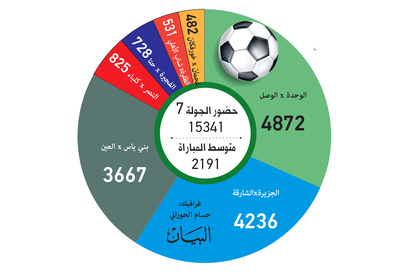 أما أكبر حضور جماهيري خلال الجولة السابعة فقد شهدته مباراة الوحدة مع الوصل والتي حرص 4872 مشجعاً على حضورها ودعم لاعبي الفريقين، وهو عدد ليس بالكبير مقارنة بأهمية المباراة ومكانة الناديين الجماهيرية، كما شهدت مباراة الجزيرة مع الشارقة حضور 4236 مشجعاً ما أضاف إلى المدرجات بريقاً أسهم في زيادة حماس اللاعبين، وتقديم أداء طيب خاصة من فريق الشارقة الذي يواصل تميزه واعتلاءه صدارة المسابقة، كما شهدت مباراة بني ياس مع العين أكبر حضور جماهيري في ملعب الشامخة خلال الموسم الحالي، حيث حرص 3667 مشجعاً على حضور المباراة ودعم لاعبي الفريقين.