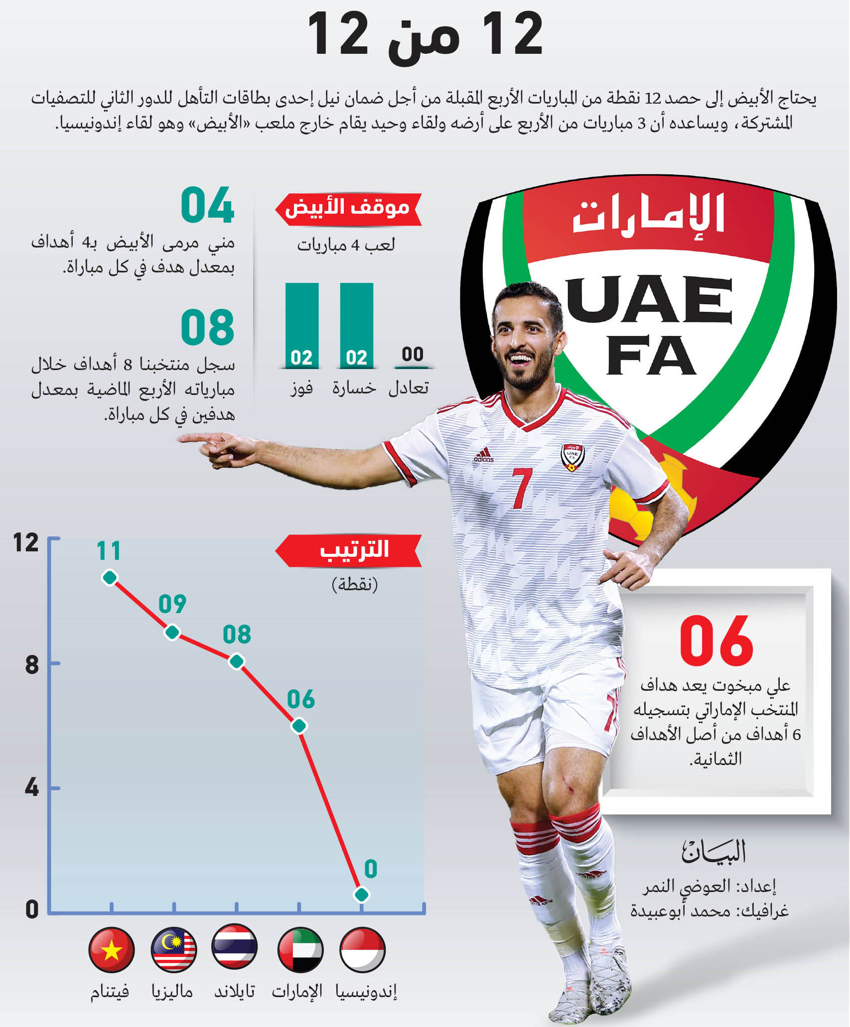 ويحتاج الأبيض إلى النقاط الكاملة من مبارياته الأربع المقبلة بالتصفيات المشتركة ليجمع 12 نقطة، نظراً لقوة المنافسة في المجموعة السابعة التي يحتل فيها منتخبنا الوطني الأول المركز الرابع برصيد 6 نقاط من 4 مباريات، مع وجود فارق 5 نقاط فقط بين أول أربعة منتخبات، حيث يتصدر فيتنام الترتيب برصيد 11 نقطة من 5 مباريات، وبفارق نقطتين أمام ماليزيا بالمركز الثاني، و3 نقاط عن تايلاند بالمركز الثالث، ويطمح «الأبيض»، إلى تحقيق الفوز بالمباراة المقبلة أمام ماليزيا، من أجل العودة بقوة للمنافسة.