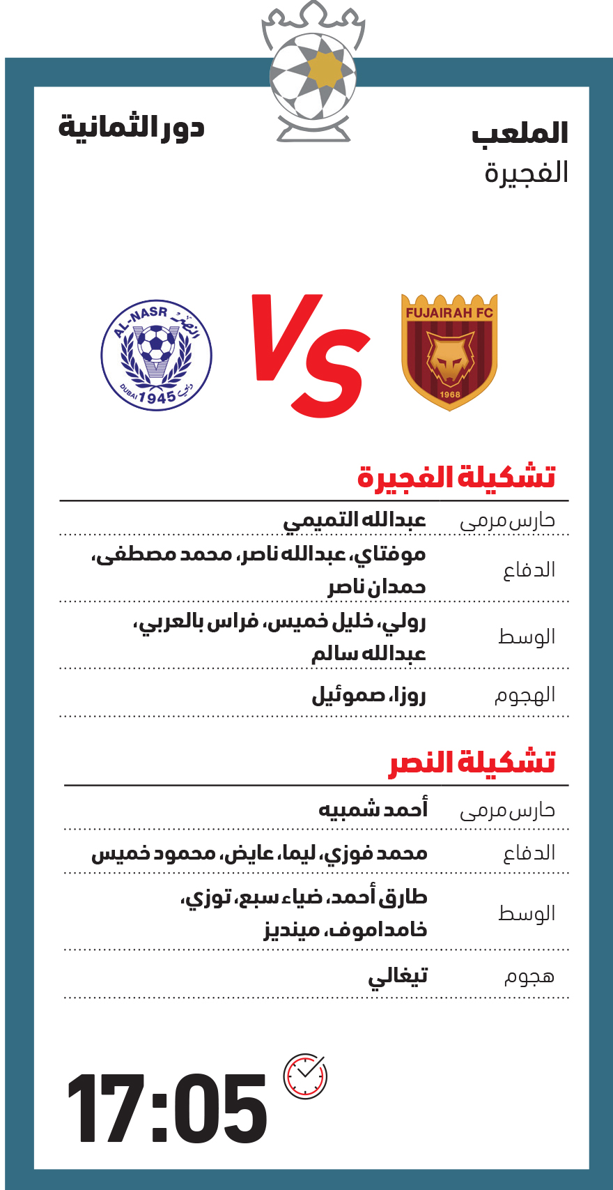 يبحث فريقا الفجيرة والنصر عن بطاقة التأهل لمربع الكبار ضمن مسابقة كأس الخليج العربي، وذلك عندما يلتقي الفريقان اليوم في إياب دور الثمانية وليلة الحسم، وانتهى الذهاب بالتعادل الإيجابي بهدف لكل فريق، وهي النتيجة التي تنصب في مصلحة الفجيرة «صاحب الأرض»، في حين يتطلع النصر إلى مواصلة رحلة الدفاع عن لقبه بنجاح، مطالباً بتحقيق الفوز على الذئاب أو التعادل بنتيجة أكبر من 1-1، لتحقيق هدفه.
