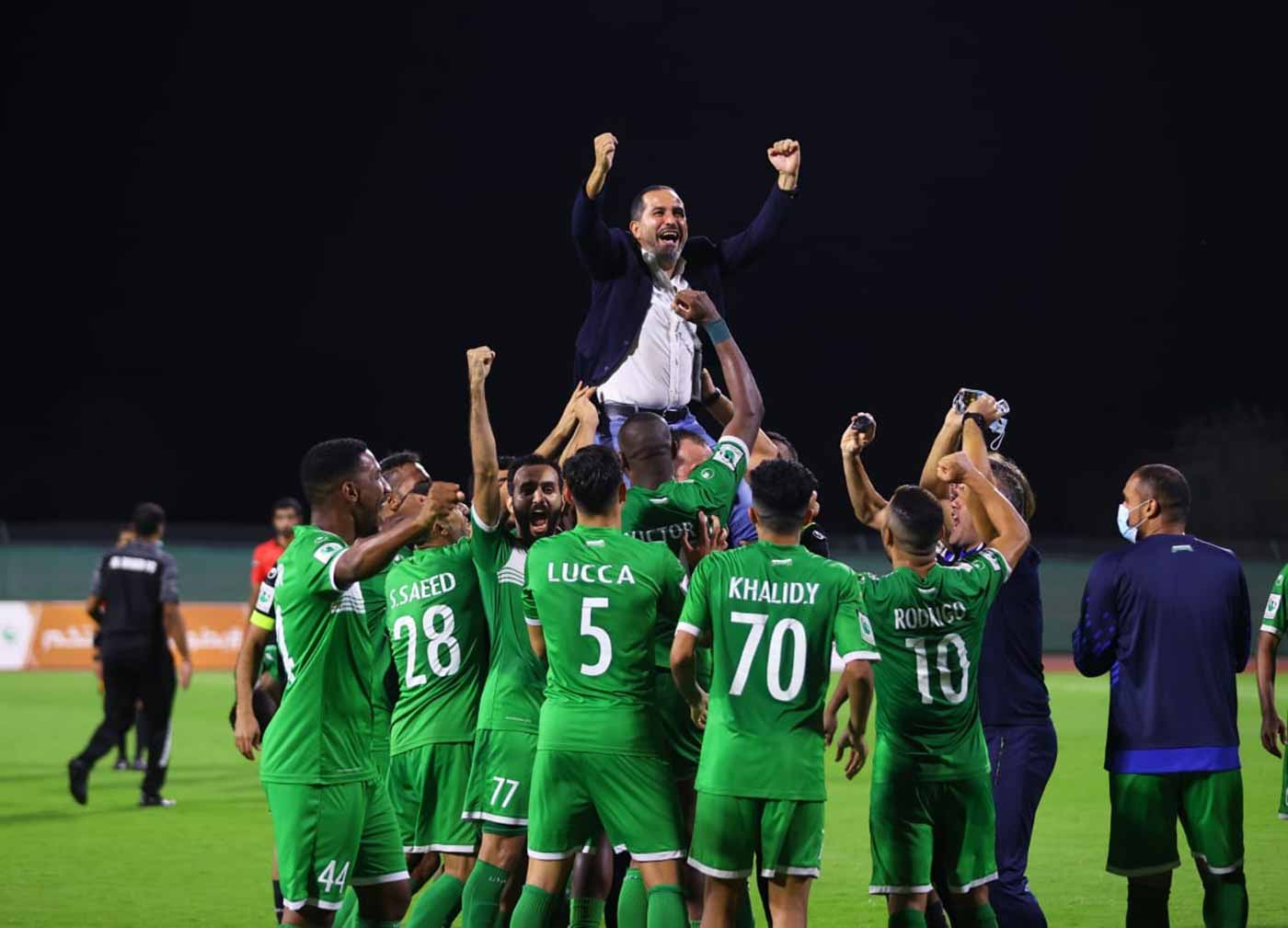 وعقب إطلاق حكم المباراة علي الزرعوني صافرته معلناً فوز العروبة، عمَّت الفرحة إرجاء ملعب الذيد، وحمل اللاعبون مدربهم التونسي فتحي العبيدي على الأعناق، ليطوفوا به حول الملعب، في مشهد طال انتظاره من قبل جماهير الفريق العرباوي.