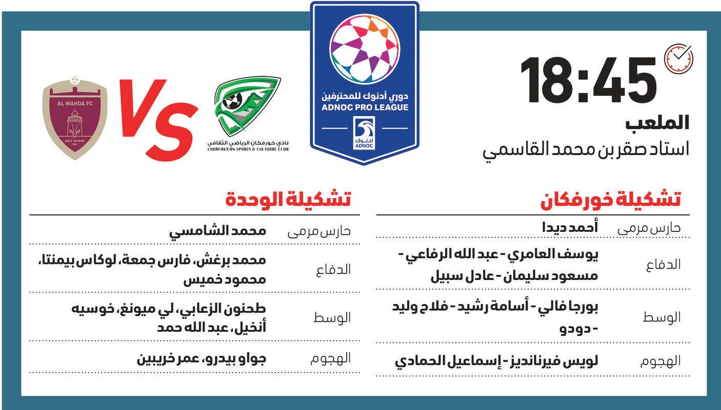يدخل الوحدة اختبار خورفكان ساعياً إلى تصحيح الصورة السيئة التي ظهر عليها في الجولة الماضية أمام بني ياس وانتهت بالتعادل 1-1، إذ يأمل الوحدة تحقيق الفوز الثاني له في المسابقة والذي سيكون فوزاً مهماً قبل المواجهة المرتقبة بعد أيام قليلة أمام الشارقة في دور الـ16 من دوري أبطال آسيا.