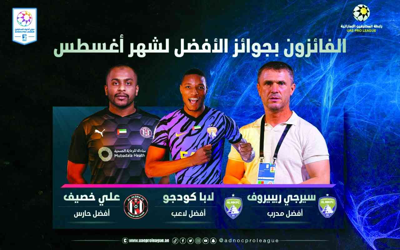 أعلنت رابطة المحترفين الإماراتية أسماء الفائزين بجوائز الأفضل الشهرية، في دوري أدنوك للمحترفين، عن شهر أغسطس الماضي، بفوز التوغولي لابا كودجو، مهاجم العين، بجائزة أفضل لاعب، والبلغاري سيرجي ريبيروف، مدرب العين، بجائزة أفضل مدرب، وعلي خصيف، قائد الجزيرة، بجائزة أفضل حارس مرمى. وجاء فوز الثلاثي في ختام التصويت، الذي استمر على مدار الـ48 ساعة الماضية، عبر الموقع الإلكتروني والتطبيق الرسمي لرابطة المحترفين الإماراتية، وسط إقبال كبير من الجماهير.