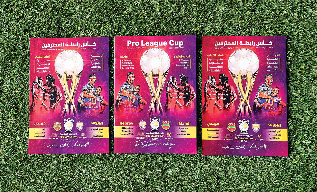 قامت رابطة المحترفين الإماراتية، بإعداد وتوزيع مجلة خاصة لنهائي كأس رابطة المحترفين، الذي يجمع العين وشباب الأهلي، يوم الأربعاء، على استاد محمد بن زايد في أبوظبي، تحت شعار «بشوفتكم يحلى العيد»، وهو الإصدار الذي تم تصميمه وإعداده ليضم معلومات متكاملة عن الحدث، وسيتم توزيعه يوم المباراة بالإضافة إلى توافر نسخة إلكترونية في الموقع الرسمي للرابطة www.uaeproleague.ae على الرابط التالي: https://bit.ly/3OQOlBf