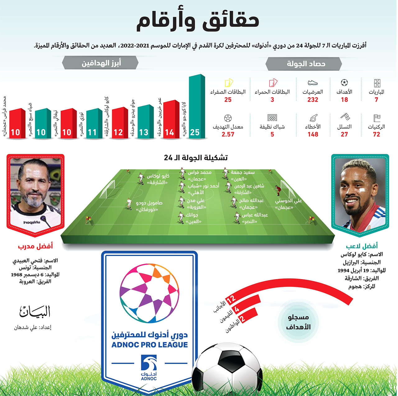 يوسف عزير، نجم كرة القدم الإماراتية سابقاً، الناقد الرياضي حالياً، شدد على أن الصورة باتت واضحة جداً بعد الجولة 24 من الدوري، بحسم العين صراع درع البطولة لمصلحته، وضمان فرق الشارقة والوحدة والجزيرة لأضلاع المربع، ومعرفة الهابط الأول، وهو فريق الإمارات، لافتاً إلى أن فريق العروبة، يبدو الأقرب لضمان البقاء مع كبار دوري «أدنوك».