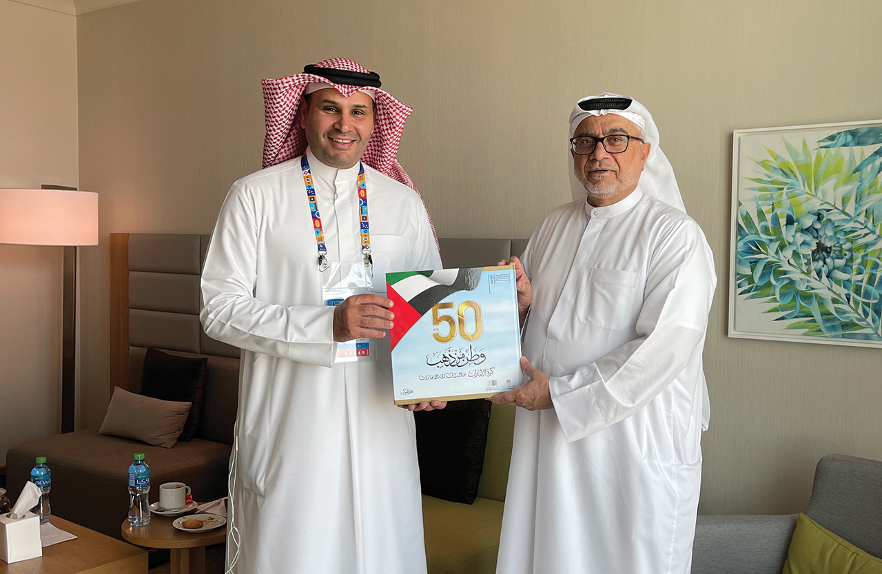 قدم محمد الجوكر المستشار الإعلامي في صحيفة البيان أمين عام جمعية الإعلام الرياضي، كتاب «وطن من ذهب» لسطام السهلي رئيس الاتحاد الآسيوي للصحافة ورئيس لجنة الإعلام الرياضي في اللجنة الأولمبية الكويتية، وذلك على هامش حضوره حفل افتتاح دورة الألعاب الرياضية الخليجية الثالثة التي تستضيفها دولة الكويت الشقيقة لغاية 31 من الشهر الجاري. وأشاد السهلي بالجهود الكبيرة من قبل الجوكر وآخرها الإصدار المميز «وطن من ذهب» الذي يوثق حكاية كرة القدم في الإمارات على مدار الـ 50 عاماً الماضية، متوجهاً بالشكر والتقدير للزميل محمد الجوكر على هذه اللفتة الطيبة ومتمنياً له التوفيق في توثيق المسيرة الرياضية في الإمارات والخليج.